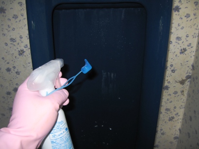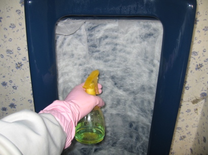 霧吹きに尿石除去剤を入れて便器に吹きつけ、便器を湿らせます。尿石除去剤は酸性なので、ゴム手袋と換気・マスクを忘れずに。