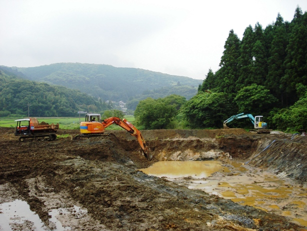 これは一週間前の写真。この池は大体掘れましたが、台風と雨の影響で、土手の補強や排水設備等の工事がまったく手を付けられずにいます。