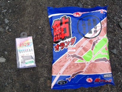 本日の餌と仕掛け。オランダ仕掛けと鮎用オランダの餌。市内の釣具屋で購入。