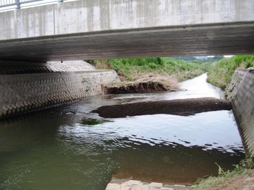 今日のポイント。自宅から車で10分。あくまで聞いた話ですが、ここはよく釣れるそうです。川幅約4m。雨降ったばかりなのに水少なめ。
